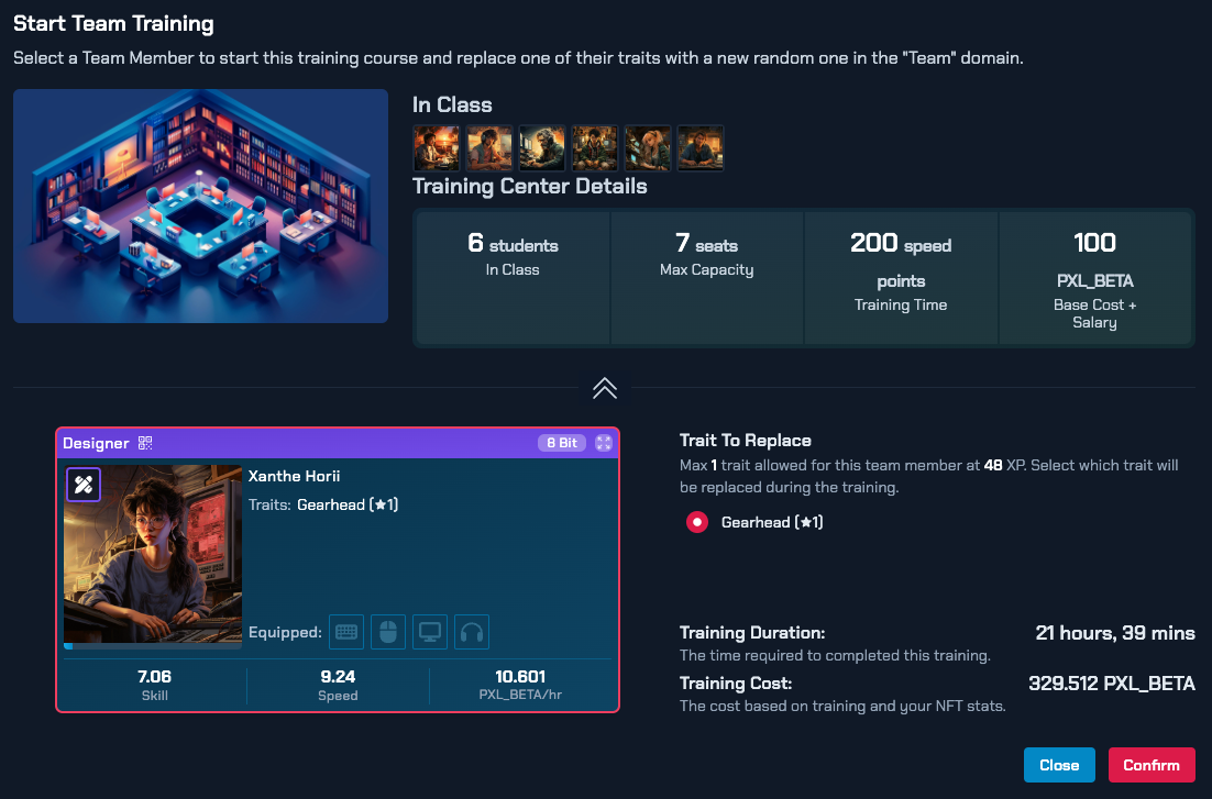 When you send an NFT to training, you will select an eligible Trait to be removed, pay the cost in $PXL, and wait for the Training to conclude. A random new Trait from the chosen domain will be assigned to the NFT at the end. It is possible to roll a better Tier of Trait through this action, but this is a fairly rare occurrence.