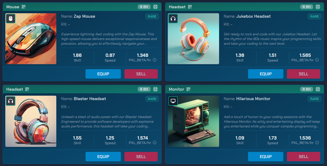 In Rise of the Pixels, each team member uses generic computer equipment by default. However, the team members can be equipped with a unique and helpful NFT accessory. These items not only add a touch of personalization but also provide valuable boosts to your Workers' main stats: **skill** and **speed**. However, they also increase the overall **cost** for the Worker, so balance is key!